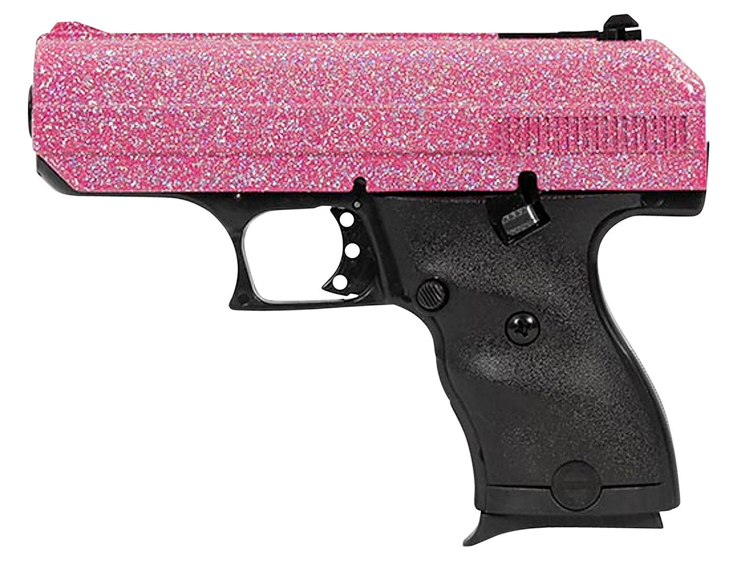 The Hi-Point C9 features a pink sparkled finish on the serrated slide; polymer frame; +P rated; 3-Dot, fully-adjustable rear sight; last round lock open; magazine disconnect safety and quick on/off thumb safety. Includes extra rear peep sights and trigger lock.