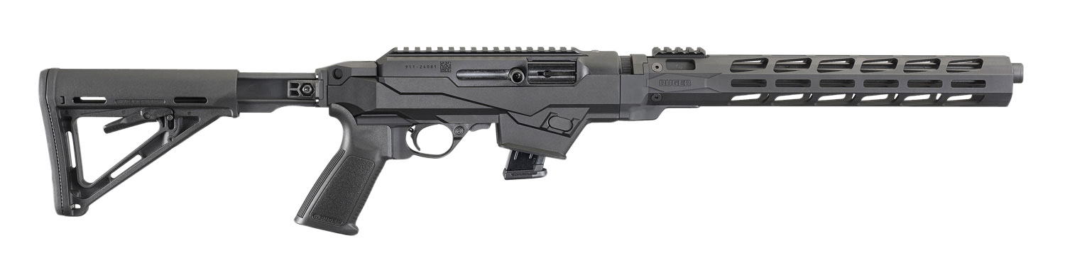 The Ruger PC Carbine features an integrated Picatinny-style rail and in Type III hard-coat anodized for maximum durability. interchangeable magazine wells for use of common Ruger and Glock magazines. Ships with SR-Series pistol magazine well installed and an additional magazine well accepting Glock magazines is included; accurate sighting system with adjustable ghost ring rear aperture sight and non-glare, protected blade front sight; Soft rubber buttpad with spacers allows the rifle to be properly sized for different shooters or varying levels of outerwear or defensive gear; durable glass-filled nylon synthetic fixed buttstock features a proprietary texture for enhanced control and an integral sling mount for rapid sling attachment; light, crisp trigger pull with minimal overtravel and positive reset utilizing proven 10/22 trigger components and the pinned & welded barrel provides consistent accuracy, while barrel fluting sheds unnecessary weight and allows for quick handling. Includes one SR-Series pistol magazine, three 1/2″ spacers and hex wrenches for rear sight adjustment, buttpad spacer adjustment and charging handle removal.