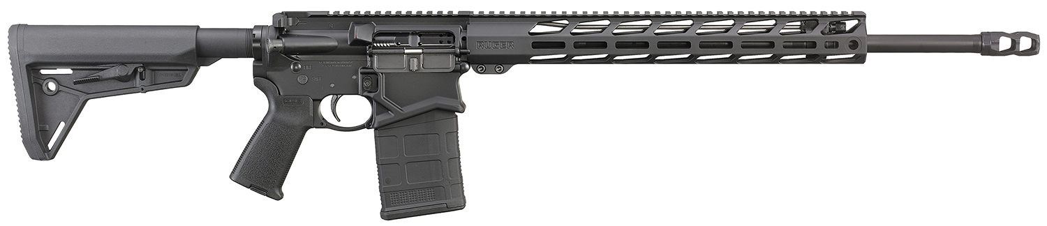 A true Small-Frame Autoloading Rifle, the SFAR is nearly identical in size to a traditional modern sporting rifle. Features Picatinny rail; venting holes in the upper receiver, barrel extension and bolt carrier ensure that excess gas is directed safely away from the user; 15″ M-LOK aluminum handguard; QD sling swivels; Magpul MOE SL stock and MOE grip; receiver end plate includes an additional socket for a QD sling swivel; compatible with most mil-spec MSR trigger groups, receiver end plates, charging handles, pistol grips, and adjustable stocks; heavy profile barrel; Ruger 2-port Boomer muzzle brake and a Ruger Elite 452 trigger. Includes a 3/16″ ball-end wrench, a 20rd Magpul PMAG magazine and is compatible with SR25/AR-10-pattern .308 Win/7.62 NATO magazines.