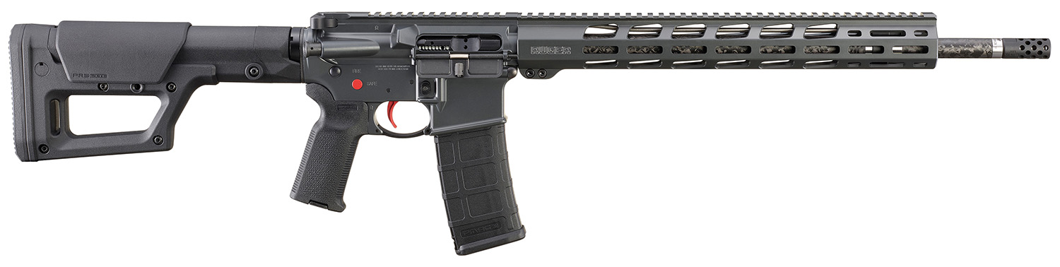 Features an 18″ PROOF Research carbon fiber wrapped barrel that is both attractive and significantly lighter than standard barrels, while still offering excellent accuracy and repeatability. Features a rifle-length gas system paired with chambering in .223 Wylde, a well-established chamber geometry that safely, accurately, and reliably functions with both 5.56 NATO and .223 Remington ammunition. Lower receiver is fitted with Magpul PRS Lite stock that balances the rifle and has secure length of pull and comb height adjustments for the best fit. Magpul MOE-K2 grip provides ergonomic access to trigger and safety controls. Handguard is free-floated for accuracy and the slim, 15″ length provides enhanced ergonomics. Bolt is mil-spec 9310 and is machined, shot peened and proof tested for strength and durability. The Ruger Elite 452 AR-Trigger is a two-stage trigger that offers a smooth, crisp, 4.5 pound trigger pull. It features a full-strength hammer spring for consistent primer ignition and a lightweight hammer that enables a faster lock time for improved accuracy. Magpul M-LOK accessory attachment slots along the 3:00, 6:00 and 9:00 positions with additional slots on the angled faces near the muzzle. Ruger muzzle brake is a radial port design that significantly reduces felt recoil and muzzle movement. The threaded barrel allows for standard muzzle accessories to be installed. Made from aerospace-grade 7075-T6 aluminum forging, the flat top upper receiver includes a forward assist, dust cover and brass deflector. Bolt carrier and gas key have chrome-plated inside diameters to provide exceptional resistance to hot gases. The gas key is staked so that it will not loosen after extensive firing. Also includes: one, 30-round Magpul PMAG magazine.