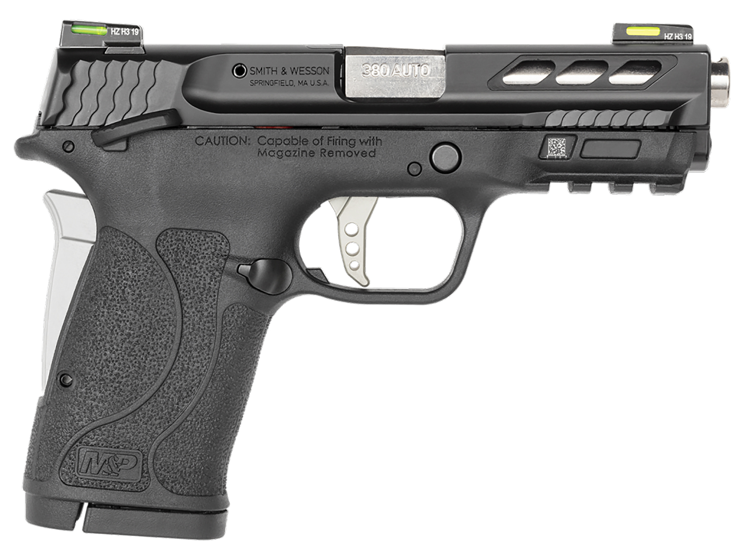 The M&P Shield is an easy to conceal pistol that offers professional grade features with simple operation and reliable performance day or night. The Performance Center Shield offers features silver trigger, grip safety and barrel; factory ported barrel and slide; lightening cuts in slide for reduced weight; Picatinny-style rail and Hi-Viz Litewave H3 Tritium/Litepipe Sights. Includes two magazines and cleaning kit.
