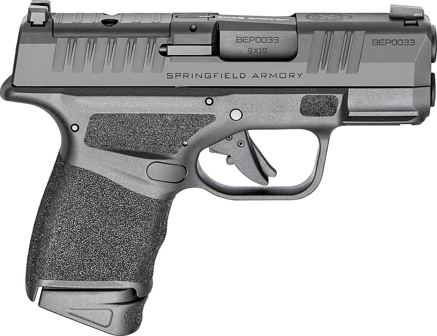 Springfield Armory micro-compact Hellcat features unique top slide serrations to maximize your grip on the slide; non-proprietary accessory rail allows you to accessories with your favorite light and/or laser; Tritium/Luminescent front sight, Tactical Rack U-Notch rear sight; reversible mag release, loaded chamber indicator and custom pressure activated grip texture. Includes 5 magazines and case.